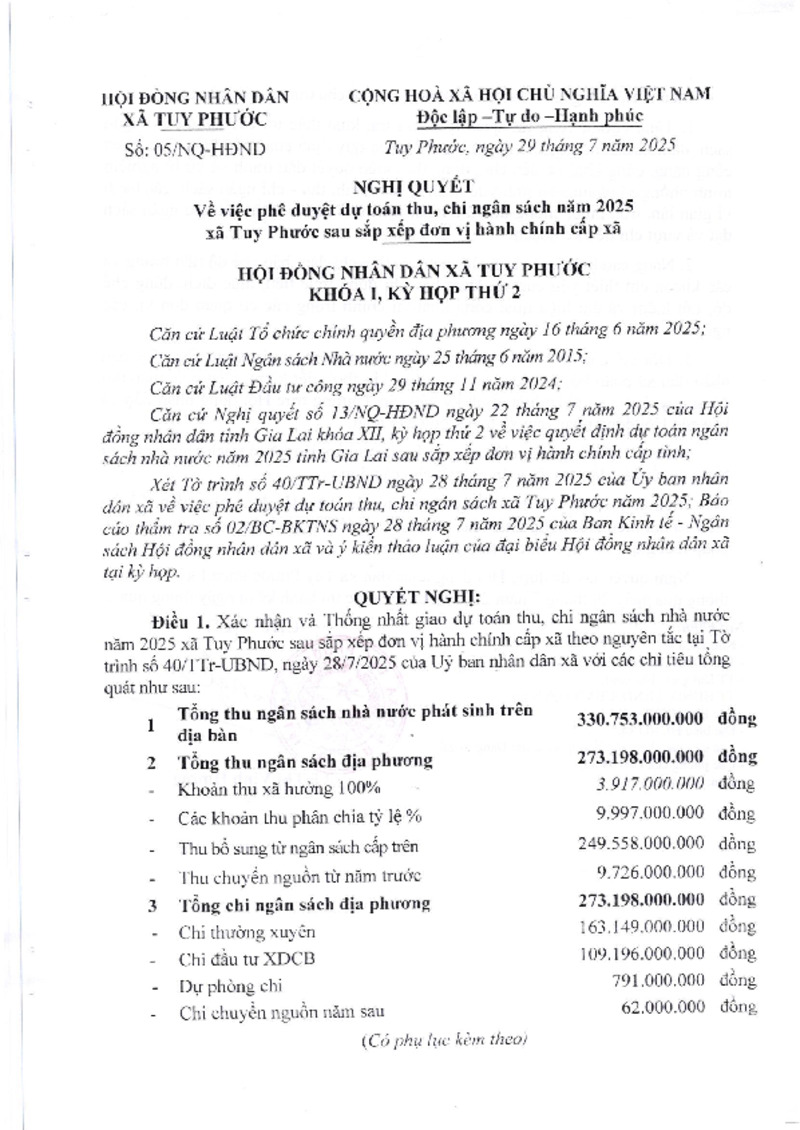 Tiêu đề văn bản | Nghị quyết số 05/NQ – HĐND ngày 29 tháng 7 năm 2025 Về việc phê duyệt dự toán thu, chi ngân sách năm 2025 xã Tuy Phước sau sắp xếp đơn vị hành chính cấp xã. | ||