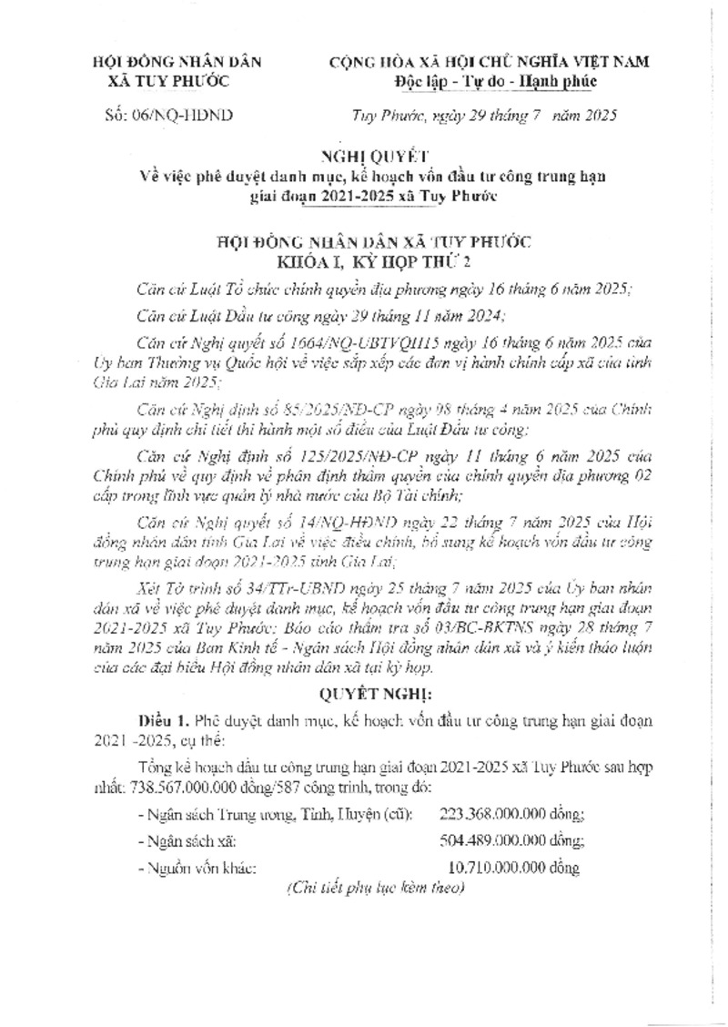 Tiêu đề văn bản | Nghị quyết số 06/NQ - HĐND ngày 29 tháng 7 năm 2025 Về việc phê duyệt danh mục, kế hoạch vốn đầu tư công trung hạn giai đoạn 2021-2025 xã Tuy Phước. | ||