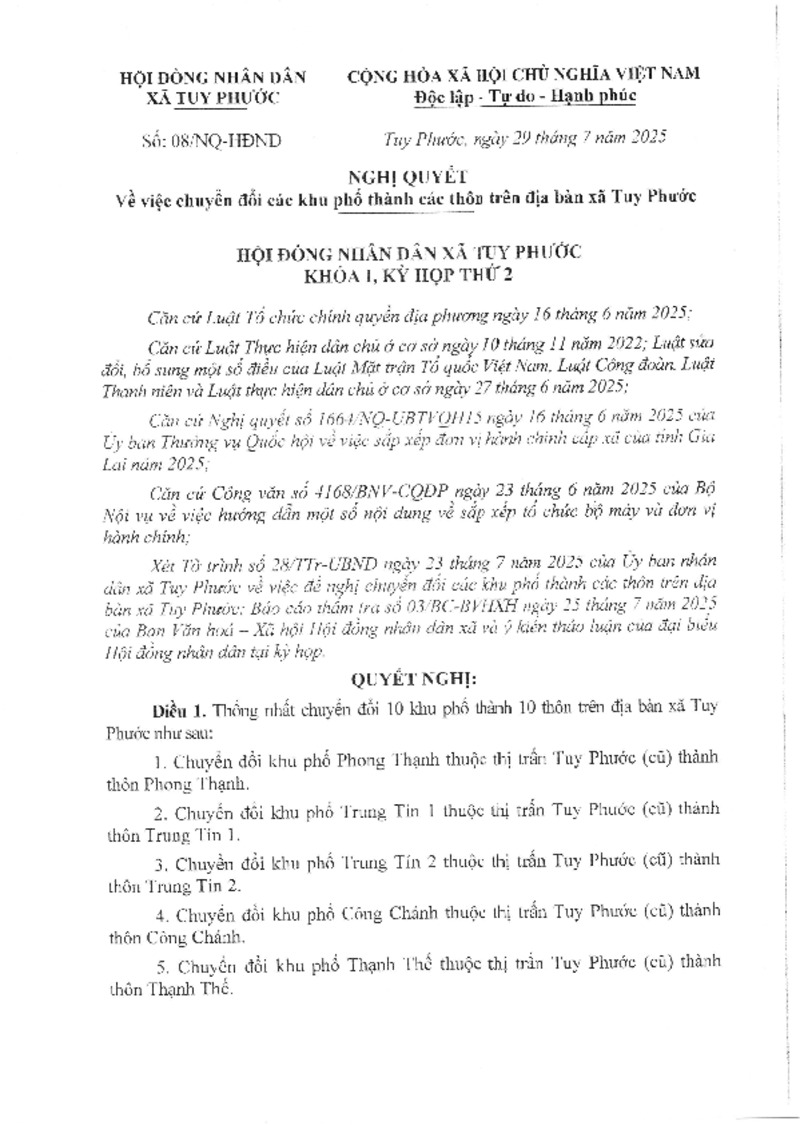 Tiêu đề văn bản | Nghị quyết số 08/NQ – HĐND ngày 29 tháng 7 năm 2025 Về việc chuyển đổi các khu phố thành các thôn trên địa bàn xã Tuy Phước. | ||