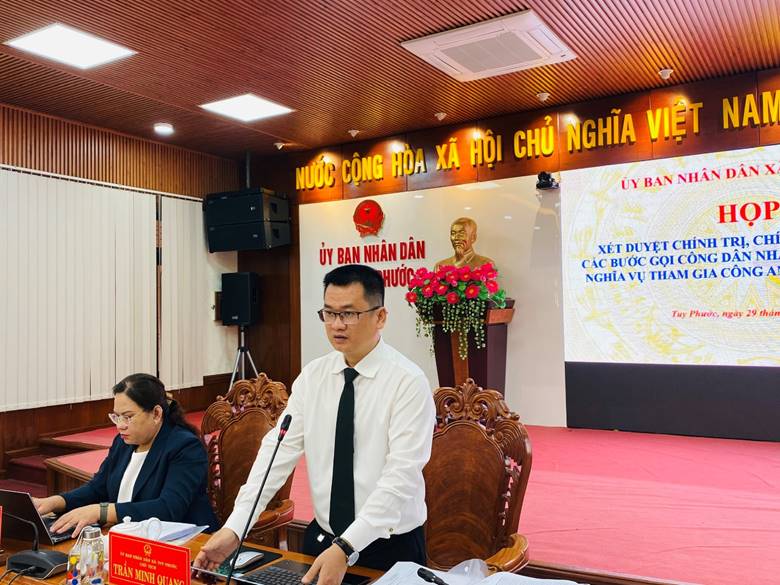 Trong hai ngày 29 và 30/9/2025, tại Hội trường UBND xã Tuy Phước, Hội đồng Nghĩa vụ quân sự (NVQS) xã tổ chức họp xét duyệt chính trị, chính sách chuẩn bị các bước gọi công dân nhập ngũ và thực hiện nghĩa vụ tham gia Công an nhân dân năm 2026.