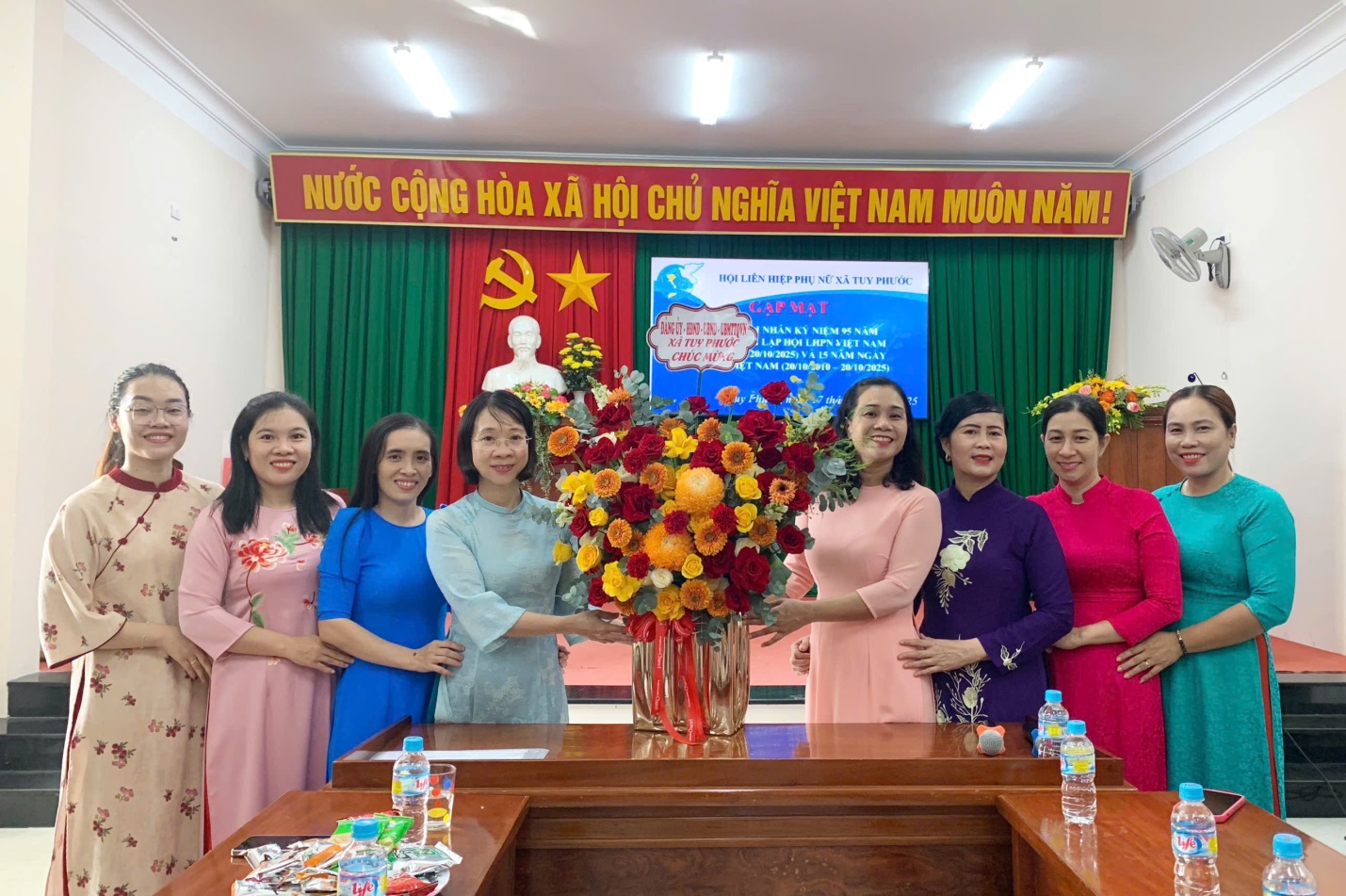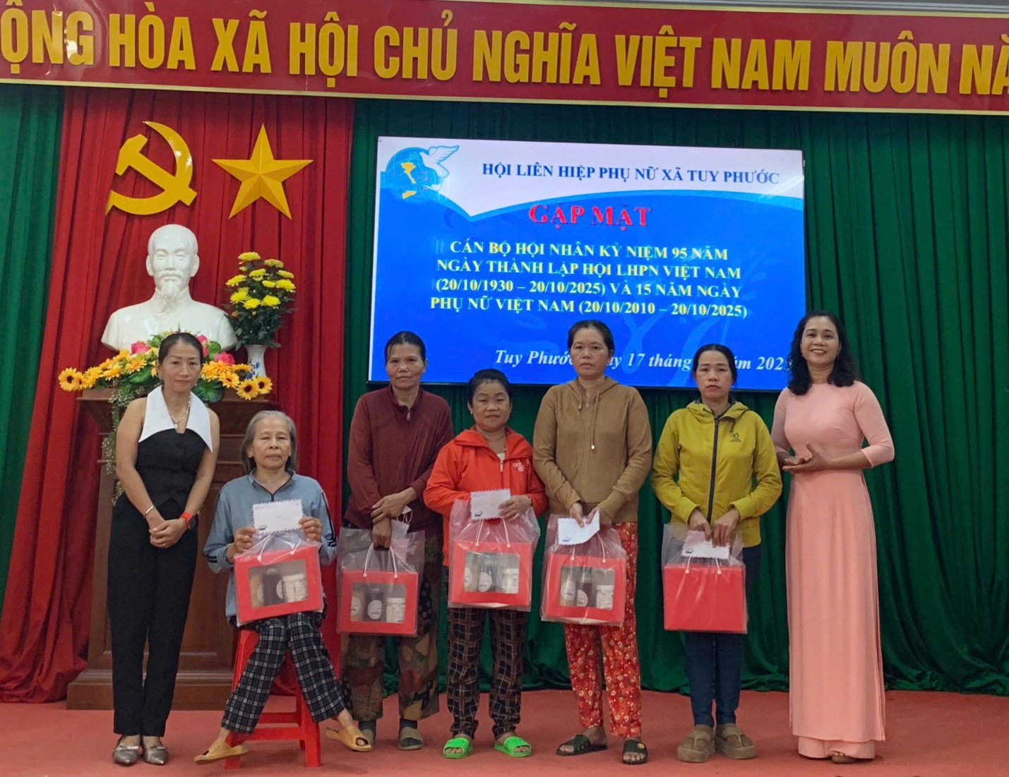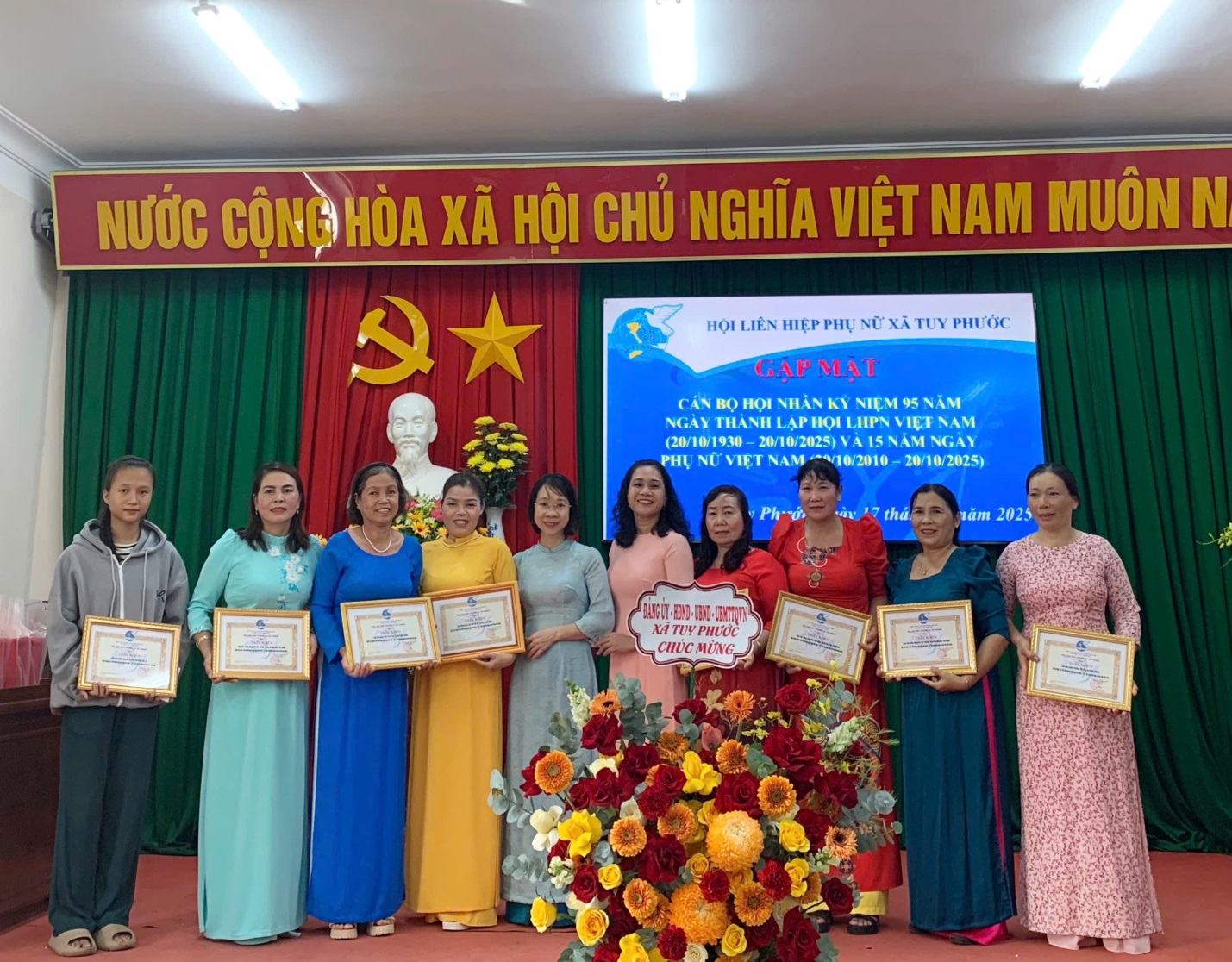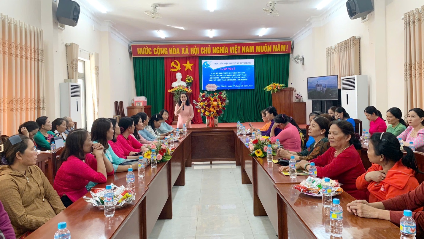 Chiều ngày 17/10, tại Hội trường UBMTTQVN xã, Hội Liên hiệp Phụ nữ (LHPN) xã Tuy Phước long trọng tổ chức buổi gặp mặt cán bộ hội nhân kỷ niệm 95 năm Ngày thành lập Hội LHPN Việt Nam (20/10/1930 – 20/10/2025) và 15 năm Ngày Phụ nữ Việt Nam (20/10/2010 – 20/10/2025). Tham dự có đồng chí Đặng Thị Bích Dâng– Phó Bí thư thường trực Đảng ủy xã Tuy Phước; các đồng chí trong BCH Hội liên hiệp phụ nữ xã cùng hơn 50 hội viên phụ nữ tiêu biểu trên địa bàn.