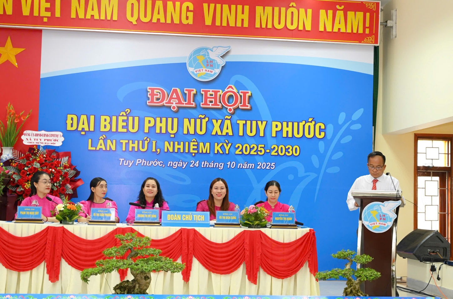 Phát biểu tại đại hội, đồng chí Vũ Thị Bích Ngọc - Phó Chủ tịch Hội LHPN tỉnh Gia Lai đã chúc mừng những thành tích nổi bật mà Hội LHPN xã Tuy Phước đạt được trong thời gian qua, nhất là trong việc củng cố tổ chức Hội sau sáp nhập, phát huy vai trò của phụ nữ trong phát triển kinh tế, bảo đảm an sinh xã hội và xây dựng đời sống văn hóa ở cơ sở. Đồng chí đề nghị trong nhiệm kỳ mới, Hội cần tiếp tục phát huy tinh thần chủ động, sáng tạo, triển khai hiệu quả các phong trào thi đua và cuộc vận động lớn của Hội; ứng dụng chuyển đổi số trong mọi hoạt động; đẩy mạnh tuyên truyền, hướng dẫn kỹ năng bảo vệ phụ nữ và trẻ em trên không gian mạng; đồng thời hỗ trợ phụ nữ khởi nghiệp, phát triển kinh tế xanh, bền vững. Đặc biệt, hội cần bám sát, cụ thể hóa các nội dung Nghị quyết Đại hội Đảng bộ xã Tuy Phước lần thứ I, nhiệm kỳ 2025-2030 trong triển khai phong trào phụ nữ và hoạt động Hội, góp phần xây dựng xã Tuy Phước đạt chuẩn phường, từng bước trở thành đô thị phát triển nhanh, toàn diện, bền vững.