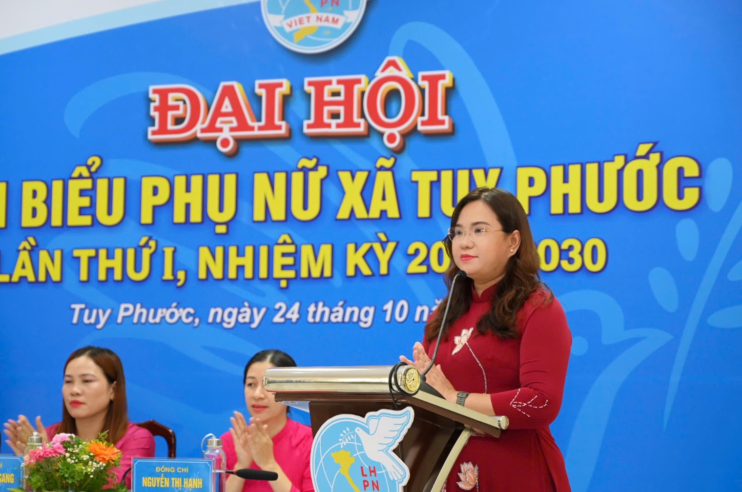 Phát biểu chỉ đạo tại Đại hội, đồng chí Lê Thị Vinh Hương – Tỉnh ủy viên, Bí thư Đảng ủy, Chủ tịch HĐND xã Tuy Phước đã biểu dương và ghi nhận những nỗ lực, đóng góp to lớn của Hội LHPN xã cùng toàn thể cán bộ, hội viên phụ nữ trong việc thực hiện hiệu quả các phong trào thi đua và nhiệm vụ chính trị của địa phương thời gian qua. Đồng thời nhấn mạnh, bước vào nhiệm kỳ mới trong bối cảnh đất nước hội nhập sâu rộng, chuyển đổi số và phát triển kinh tế xanh, công tác Hội cần tiếp tục đổi mới nội dung, phương thức hoạt động, phát huy tinh thần đoàn kết, sáng tạo, hướng mạnh về cơ sở, lấy lợi ích thiết thực của phụ nữ làm trung tâm; chú trọng hỗ trợ phụ nữ phát triển toàn diện, nâng cao quyền năng kinh tế, tham gia xây dựng Đảng, chính quyền, bảo vệ quyền và lợi ích hợp pháp, chính đáng của phụ nữ và trẻ em. Hội LHPN xã cần tập trung quán triệt và triển khai hiệu quả Nghị quyết Đại hội Đảng các cấp, đổi mới hoạt động, đa dạng hóa hình thức tập hợp hội viên; phát huy vai trò phụ nữ trong phát triển kinh tế, bảo vệ môi trường và xây dựng gia đình hạnh phúc; củng cố, xây dựng tổ chức Hội vững mạnh, bồi dưỡng đội ngũ cán bộ nữ có năng lực, tâm huyết; tăng cường công tác giám sát, phản biện xã hội. Đồng chí Bí thư đảng ủy xã tin tưởng rằng, với tinh thần “Đoàn kết – Dân chủ – Đổi mới – Phát triển”, đội ngũ cán bộ, hội viên phụ nữ xã Tuy Phước sẽ tiếp tục phát huy truyền thống, nêu cao tinh thần trách nhiệm, năng động, sáng tạo, hoàn thành xuất sắc các mục tiêu, nhiệm vụ mà Đại hội đề ra, góp phần xây dựng xã Tuy Phước ngày càng giàu đẹp, văn minh, hiện đại.